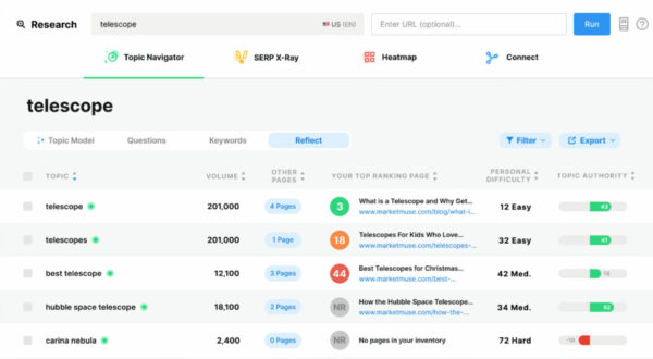 When looking at AI tools that can help you elevate your SEO, MarketMuse is another one we want to mention. In short, MarketMuse is content planning and optimization software that comes with loads of SEO and automization features. The idea is that it puts everything you need in one place and automates content audits for you. Helping suggest what to work on next instead of guessing or speculating what does or doesn’t work.