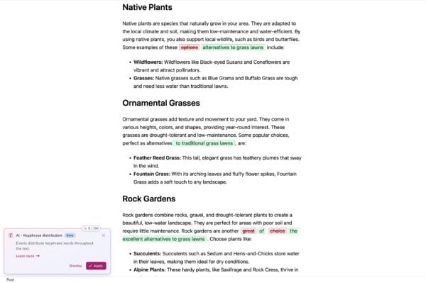 The name might already be an indicator of what this AI tool can do for you. Originality.ai helps you fact-check your text and also checks it for plagiarism. Being trustworthy is an important factor in SEO right now, and will probably remain important, so you need to get your facts straight. And make sure you’re not accidentally committing plagiarism, a growing risk in today’s AI-heavy landscapes.. Funnily enough, it also comes with an AI Content Detector which is pretty good in detecting content written by AI. Even if it has been paraphrased.