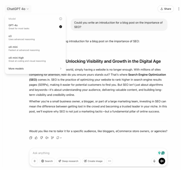 If you use ChatGPT plus, which is the paid version, you can also use the dropdown at the top left corner to select a model fitted to your needs. As you can see, these other models give you more options. But the free version of ChatGPT can still handle most basic content requests.
