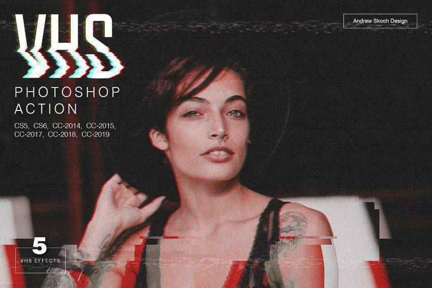This Photoshop action pack lets you use a VHS-style glitch effect on your photos. Once you hit play on the action, it will appear as though your photo has been hit with the tracking feature on old VCRs. The tracking lines across the screen distort and warp the image and create a vintage effect.