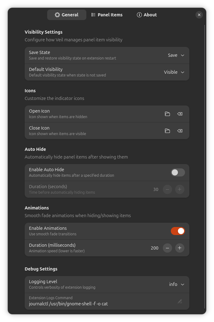 Veil comes from Dagim G. Astatkie, a software professional based out of Ethiopia. This extension addresses a common frustration among GNOME users. If you are a power user, then your top panel can quickly fill up with system indicators and status icons.