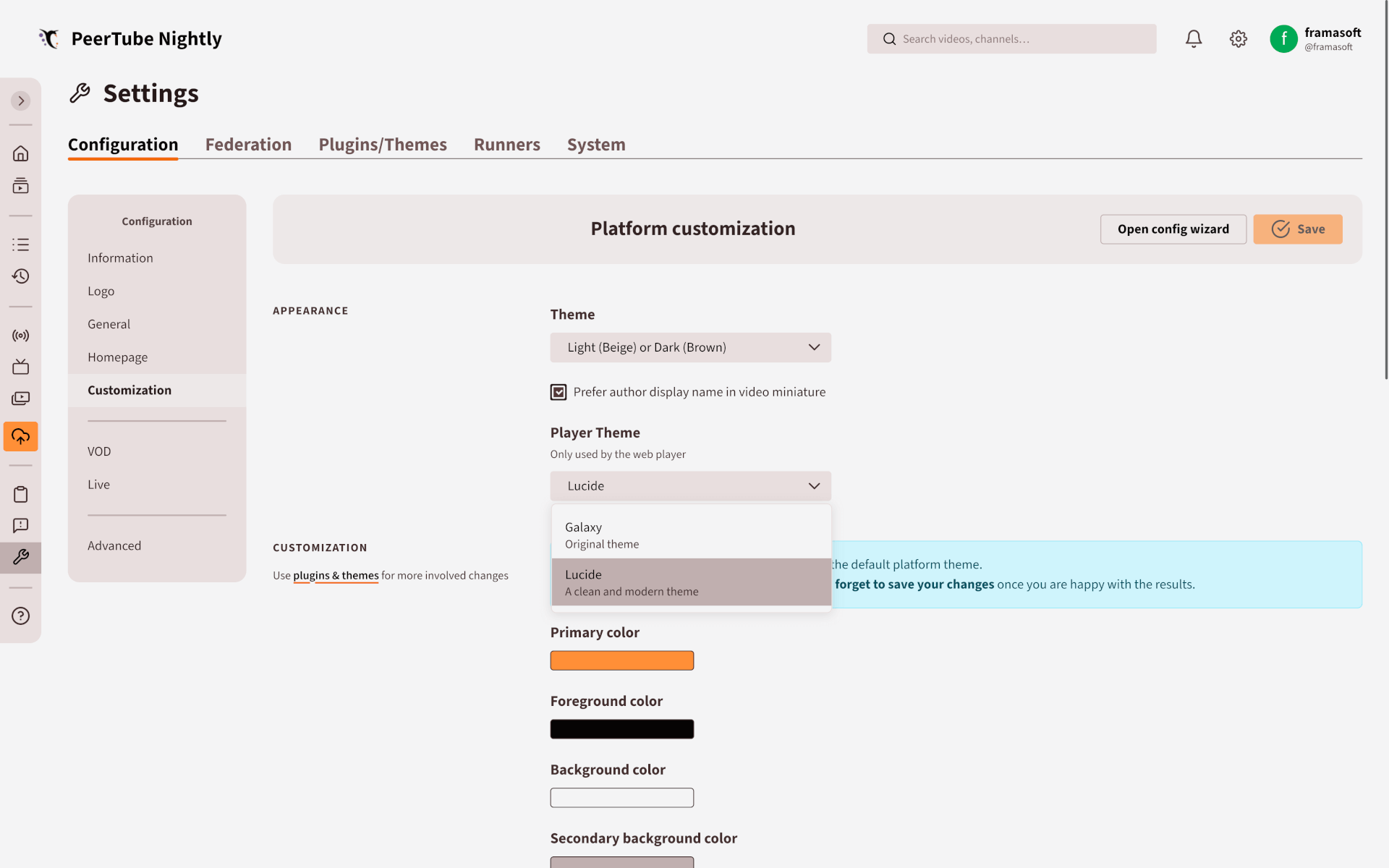 PeerTube V8’s team collaboration feature and theme selector. (Source: Framasoft)