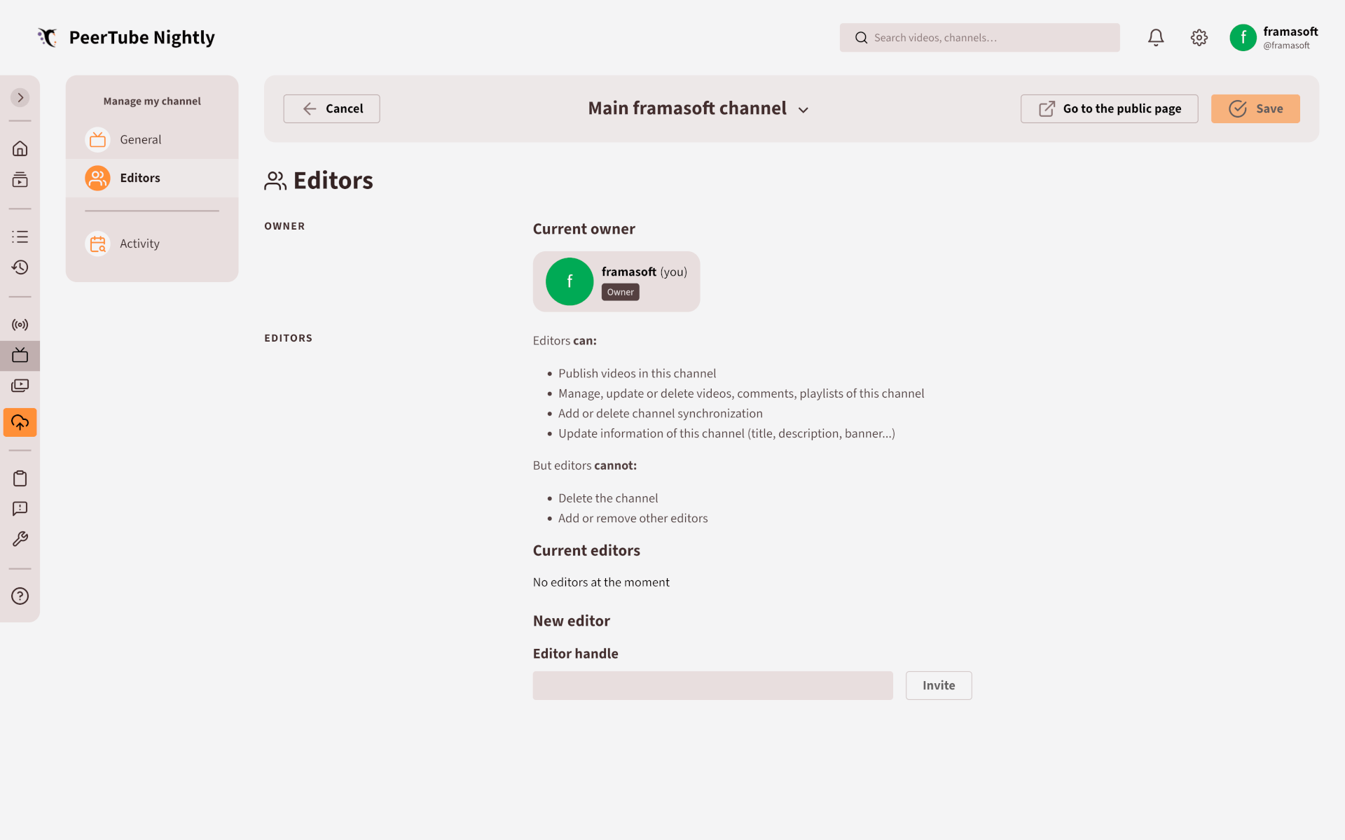 The biggest addition is team collaboration for PeerTube channels. You can now add editors to your channel who can help manage content. This was one of the most requested features. Organizations with multiple people handling videos will surely benefit from this.