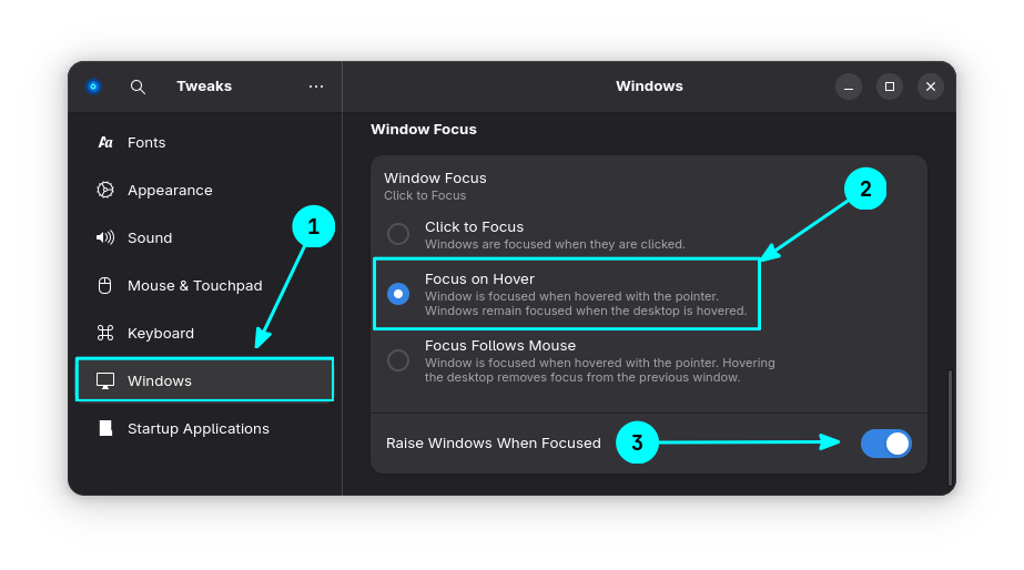 With GNOME Tweaks, you can set app window focus from “Click to Focus” to “Focus on Hover“. For doing that, open GNOME Tweaks and go into the Windows tab. Here, under Window Focus, click on “Focus on Hover“. Now, enable the “Raise Windows When Focused” toggle button.