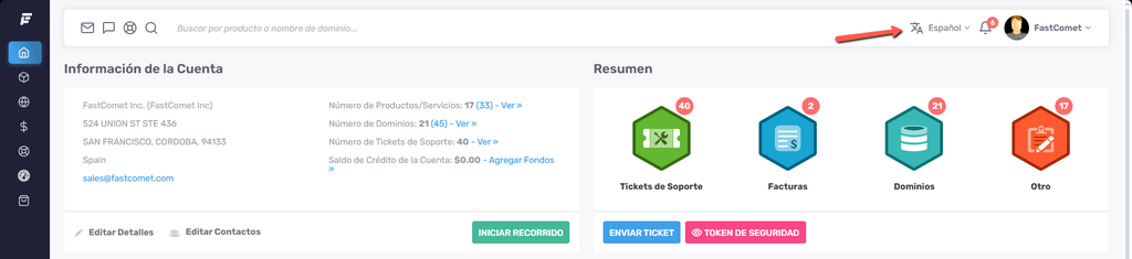 You can also change the language at any time you want; it is super easy. Simply log into your account on FastComet.com and look for the language selector at the top of the page.