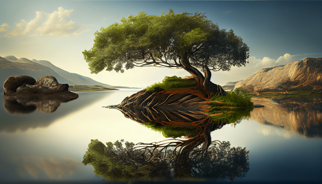 a lush forest, a single massive tree with a huge canopy of leaves, natural lighting, fantasy, undergrowth, creek, beautiful lighting, adventurous mood, cinematic lighting, landscape