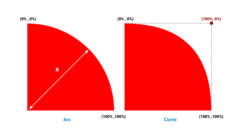 The arc command uses a radius (100%), while curve uses a control point (100% 0).