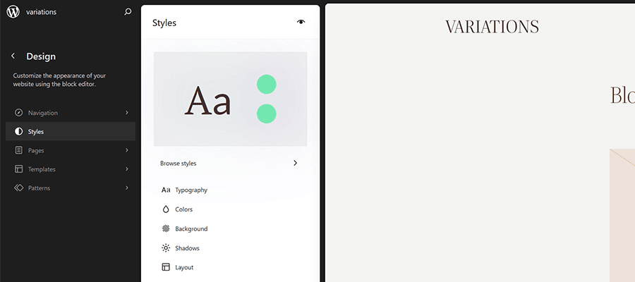 The Styles panel includes links for Typography, Colors, Background, Shadows, and Layout. You’ll also find a Browse Styles link that displays available style variations for the theme.