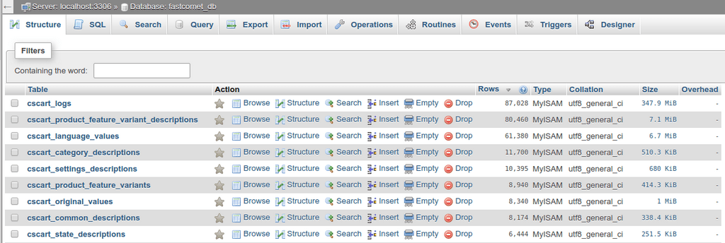 On the image below, we have a CS-Cart project’s database sorted by size. We can see a classical case of excessive browsing logs, which is causing our database query time to increase drastically. That is something we most definitely do not want, especially during promotional times. To redact this error, we will firstly click on the EMPTY button on the 1st table named cscart_logs. That will empty the table and return it to the same state as in a newly installed application.