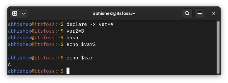 In the screenshot below, you can see that the exported variable with declare was available in the subshell while the normal variable was not.