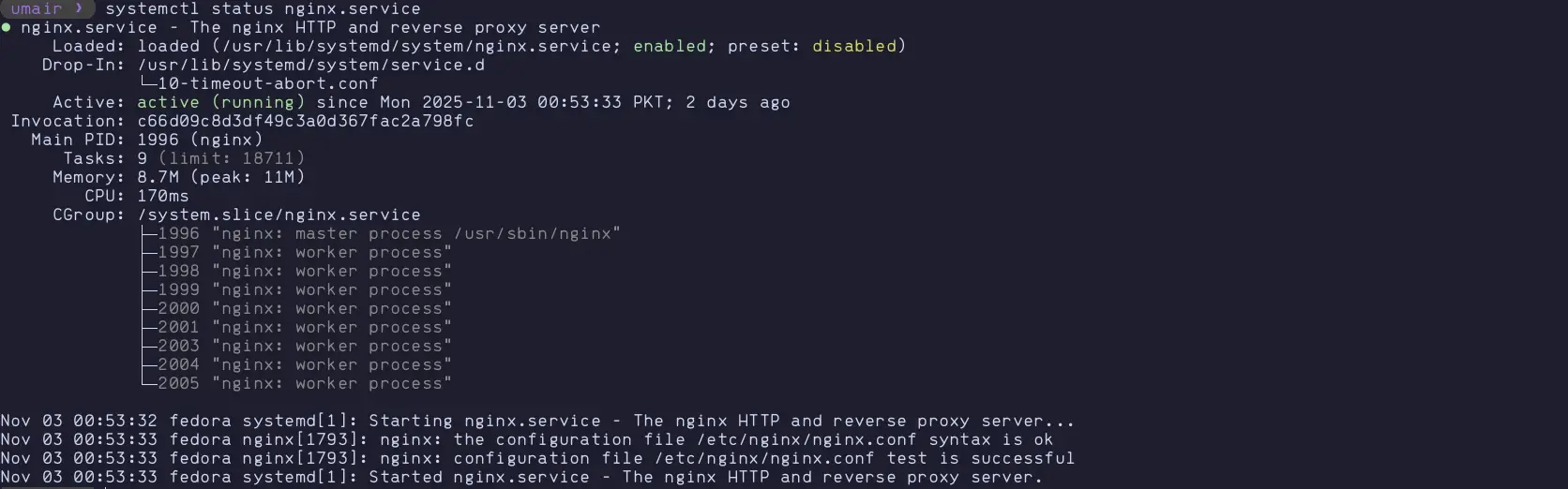 The first time I ran systemctl status nginx.service, I understood what Poettering had been talking about. Instead of a terse message like “nginx is running,” I saw a complete summary including the process ID, uptime, memory usage, recent logs, and the exact command used to start it. It was the kind of insight that had previously required grepping through /var/log/syslog and several ps invocations.